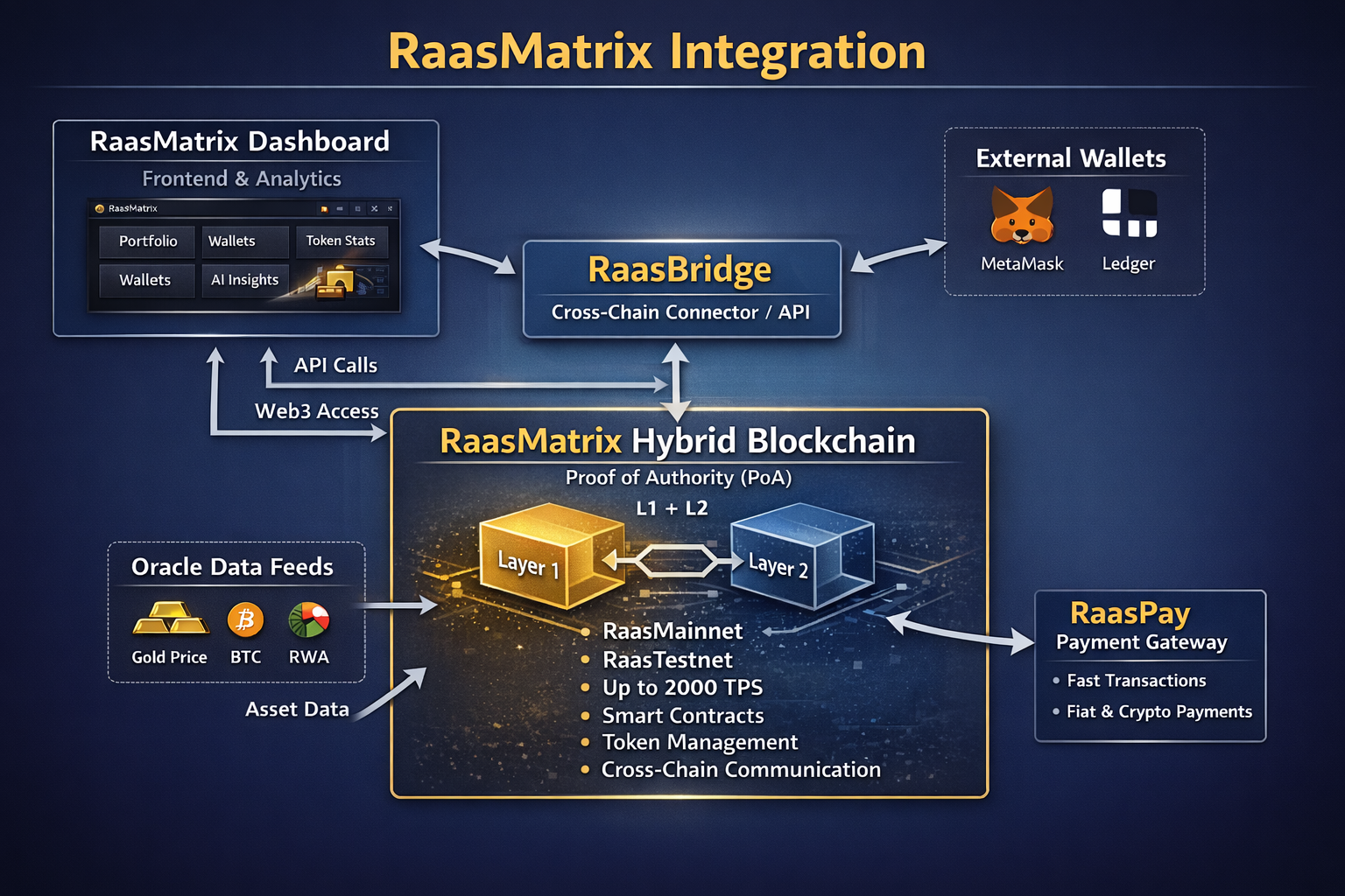 RaasMatrix is a hybrid execution and ledger fabric that underpins trust, interoperability, and programmable economic governance. It enables enterprise-grade smart contract orchestration, secure multi-system coordination, and configurable operational sovereignty, providing the foundational infrastructure for regulated, scalable, and auditable execution across Raasystem.