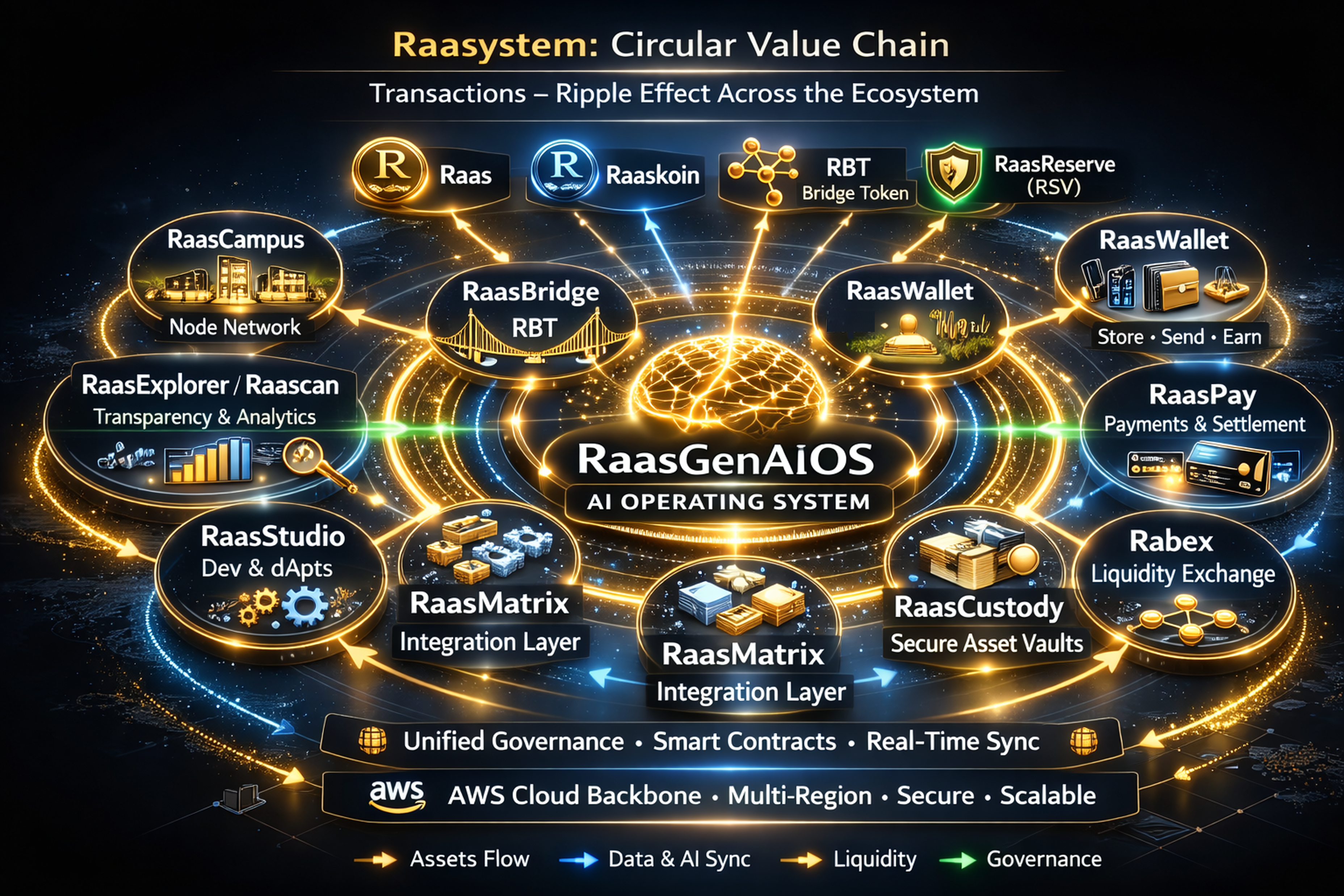 Built on AWS cloud architecture, Raasystem integrates AI orchestration, blockchain settlement, and enterprise-grade governance into a unified infrastructure layer. The platform enables secure financial interaction, compliant asset digitization, and resilient global value exchange through multi-region deployment and institutional-grade controls.