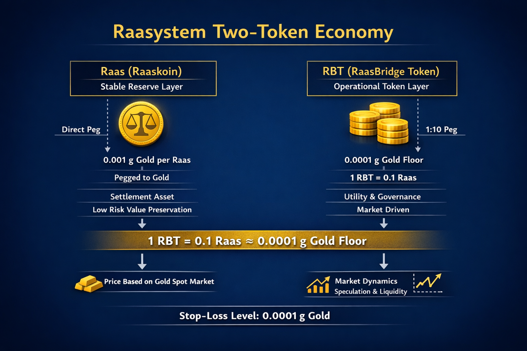 Raasystem Implements a Synchronized Dual-Token Model — designed to combine governance, operational utility, and value stability within a unified economic framework. One instrument coordinates network operations, governance oversight, and liquidity participation, while the other provides a stable settlement anchor for economic transactions.